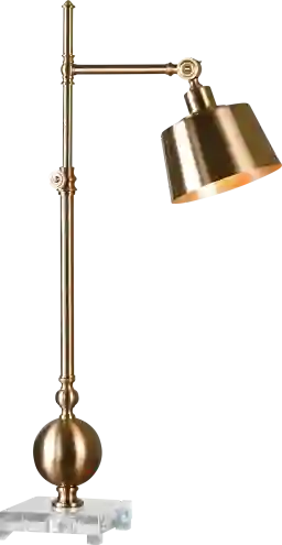 The Woodview Street lamp features a brushed brass plated metal, accented with a thick crystal foot. The shade pivots up and down and lamp is also adjustable in height. Partial assembly may be required.