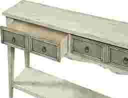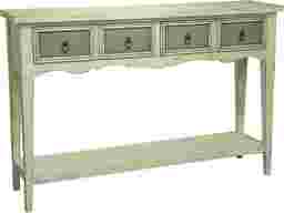 The two-tone finish of antique white with weathered grey drawer fronts gives this console table a comfortable and handmade feel. It features two drawers with two framed faux drawer fronts, and one shelf for display on the bottom nestled between the tapered legs. Some assembly required.