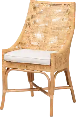 Encapsulate the charm of a tropical getaway in your space with the tranquil design of the Wrentham natural dining chair. This bohemian piece consists of a natural rattan frame wrapped in woven embellishments. The removable seat cushion is padded with plush foam and upholstered in soft fabric for superb comfort. The Wrentham will arrive fully assembled and features angled legs connected by a crisscross base for excellent stability and support. Due to the nature of the natural materials used in this product, it may have variations in areas such as, but not limited to, color, pattern, grain and texture. The hair-like strands of rattan/rattan-fiber are common due to the nature of the material.