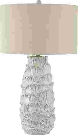 Bring a boost of brightness and a bit of organic style to your room with the Wyatt Bay lamp. Crafted from ceramic, its base showcases a creamy finish and a raised leafy pattern for a tasteful touch of texture. Up above, a beige linen drum shade rounds out the look with the understated appeal. Partial assembly may be required.