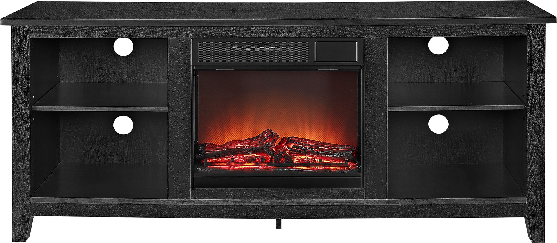 Create a warm entertaining space in any room of your home with the Wyatt black 58 in. console with firebox. Crafted from high-grade laminate with a durable finish to accommodate most flat panel TVs up to 60 inches. Features adjustable shelving to fit your components and a cable management system. Dual controls: one for heat control, one for lighting. Safety switch prevents overheating. Installation of fireplace unit requires no technician. Simply plug into a standard household outlet. No venting required. Customer assembly required.