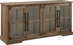 Country flair for the current age, this Wyehwood farmhouse TV stand has a historic presence mixed with all the modern modifications necessary to make this a dream entertainment stand. It has adjustable shelves and cord management options so you can organize electronics to your preference. Four tempered glass doors with a classic fretwork design feature metal corner accents that incorporate a rustic element to into this traditional console. The doors also have soft-close hinges. A beveled top and bottom add the final touches to this charming country style media stand. Customer assembly is required.