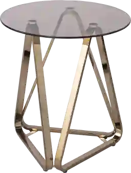 Round out your design with this contemporary Wykeham end table. Three champagne hued triangles craft a geometric base while the smoked glass tabletop adds a touch of retro flair. Slide this round table alongside your sofa to hold your magazines, or tuck between a pair of cozy armchairs to entertain family and friends. Your home gets a modern upgrade with this glass-top side table. Customer assembly is required.
