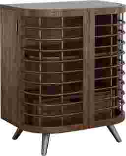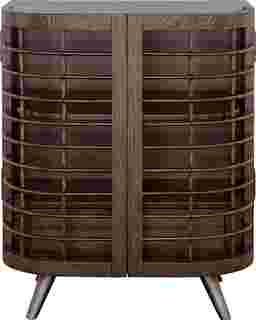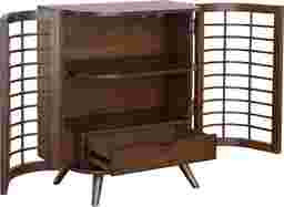 Unique is an understatement when describing this eye-catching Wyldwood cabinet that features a classic demilune silhouette with a modern twist. The gracefully curved two doors allow a peak into the interior with the open and airy lattice work design. The interior features a hidden drawer with a carved hand-pull and a single curved shelf that will nicely hold a few of your favorite novels or knick-knacks. The cabinet has been finished in a warm hickory stain and is perched atop tilted tapered legs in a silver powder coat finish. Customer assembly is required.