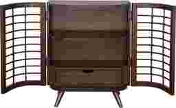 This cabinet captures the essence of mid-century modern (MCM) design through its geometric lattice work and architectural tilted tapered legs. The silver powder-coated finish on the legs adds a contemporary metallic contrast to the organic wood grain of the hickory stain, a hallmark of the MCM style that blends natural materials with industrial accents.