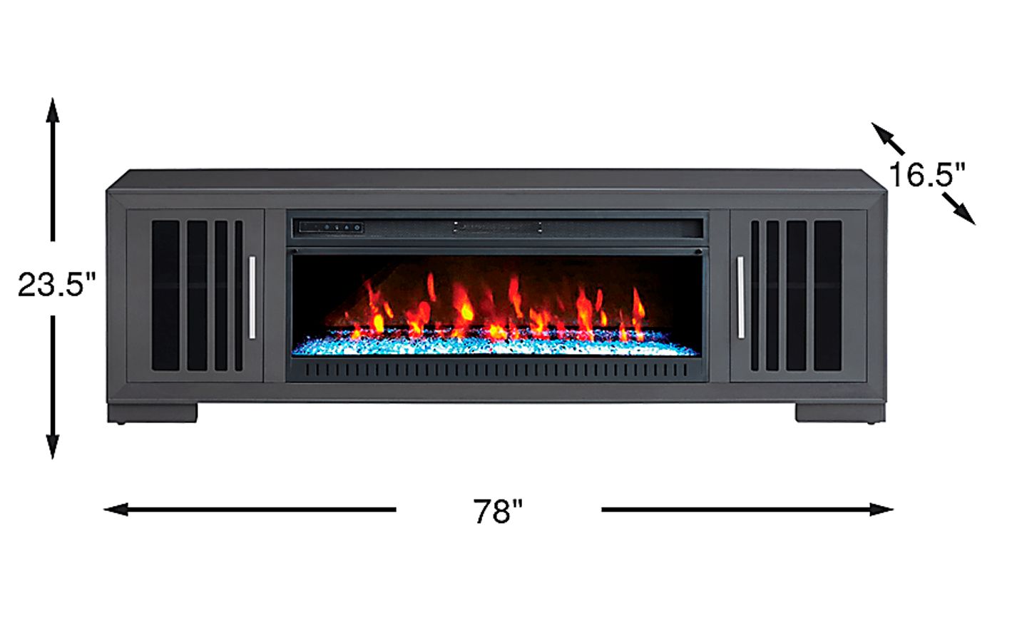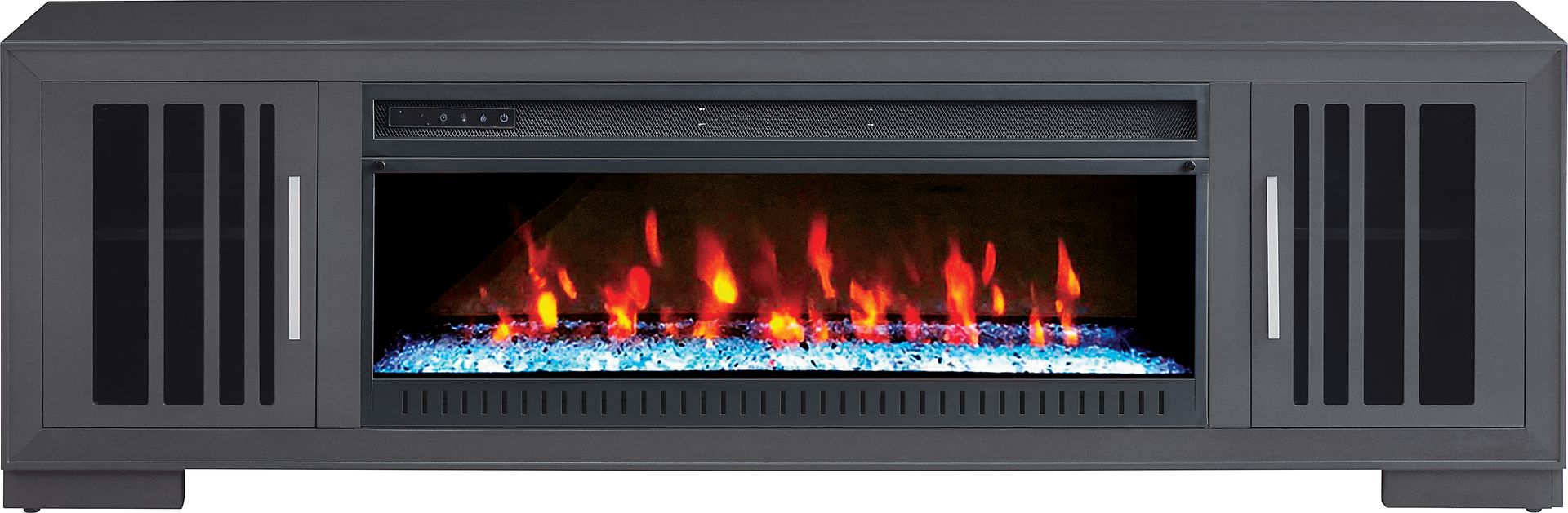 Boasting contemporary design, the Wyndell Way console displays sleek, clean lines to modernize your entertainment area. This gray console features two framed-glass doors which reveal storage space with an adjustable shelf inside. Enhancing its futuristic look, chrome-plated metal pulls and unique paneling on the doors create a modern aesthetic. Convenient pass-through holes for wire management make it easy to set up your electronic devices and keep cords neatly hidden. The crystal fireplace features an energy-saving LED firebox with remote controlled heat and ambient lighting with four color changing options (used with or without heat). When in use it can heat up to 400 square feet in a room and offers 50,000 hours of LED light. (Plugs into a standard electrical outlet max. 120V and 60Hz.)