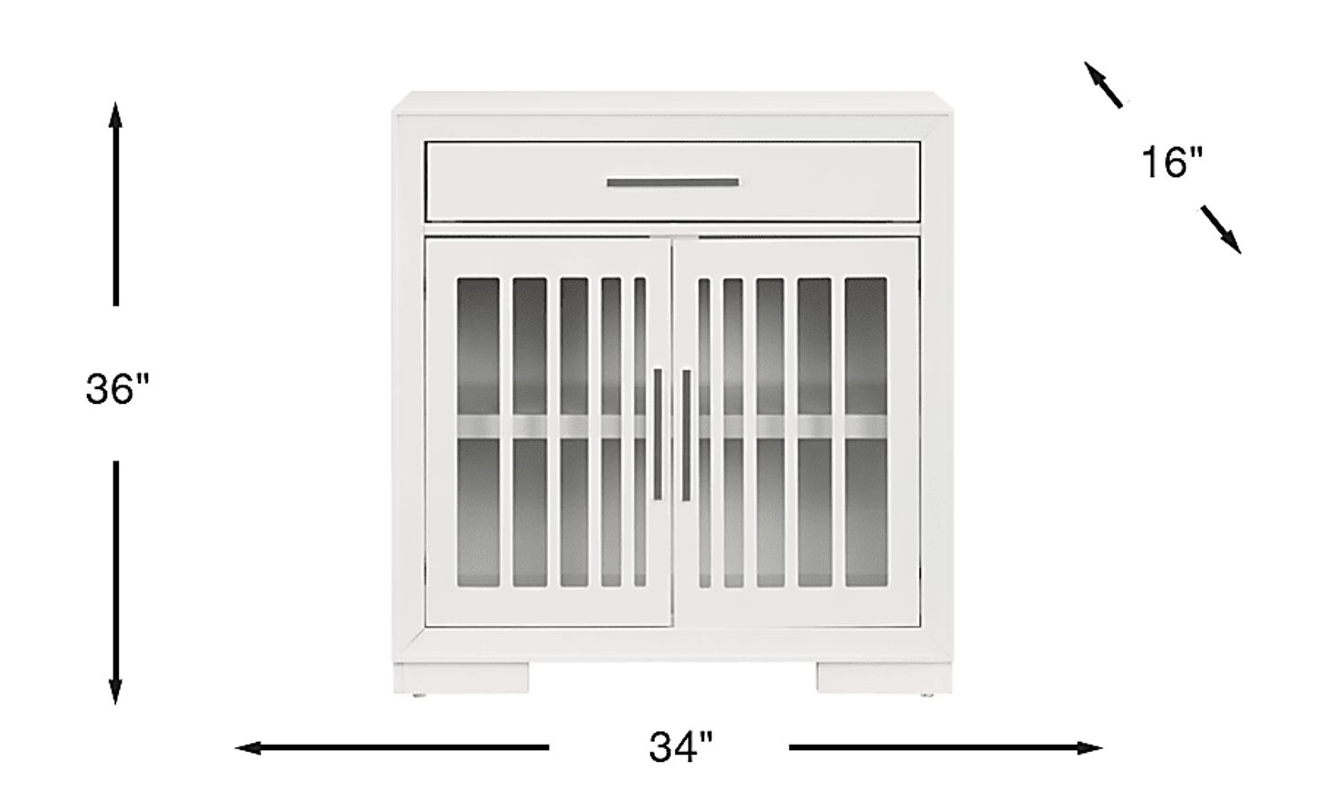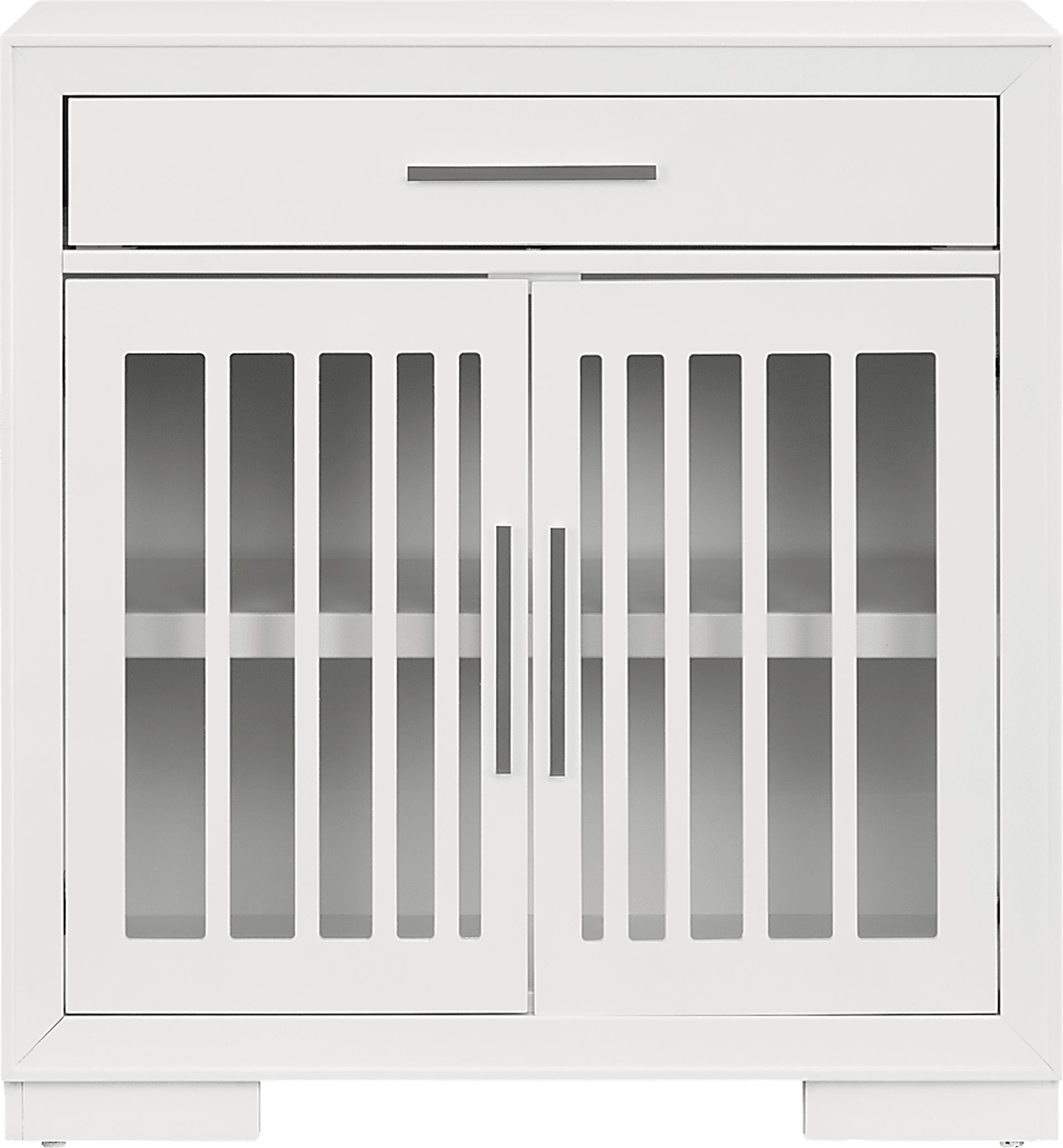 Boasting a contemporary design, the Wyndell Way accent cabinet displays sleek, clean lines to modernize your living area. Crafted with poplar solids, the white finish of this piece is accentuated by chrome-plated metal pulls and glass paneling on the doors. Adjustable shelving inside the cabinet is perfect for accents, décor and more. The drawer is constructed with front and back French dovetail joints for enhanced durability. Side mounted metal drawer glides make opening and closing it smooth.