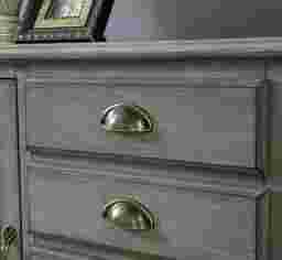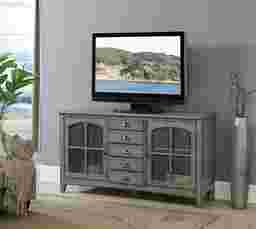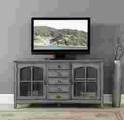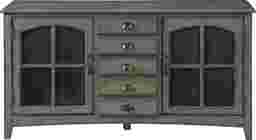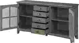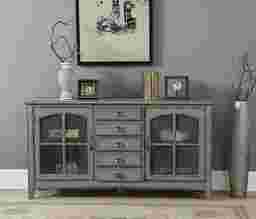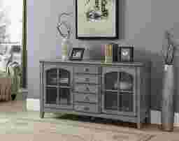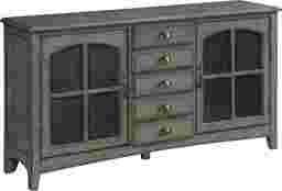 The Wynfield credenza is finished in hazy gray tone, featuring two delightfully arched windowpane doors. It is fronted with wire mesh to reveal the shelved interior and what you have stored within. It has five drawers rising vertically in the center for additional storage opportunities. Customer assembly is required. Customer assembly required.