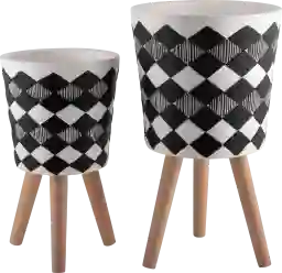 The diamond pattern on this planter set adds a sophisticated, tactile element to your decor. In a modern or minimalist home, the black-on-natural finish provides a bold geometric contrast, while in a Boho-styled space, the organic ceramic material and wood legs create a warm, artisanal feel. The set of two allows for staggered height styling, which is a classic technique used by designers to create a more balanced and intentional look.