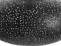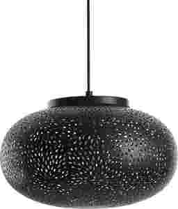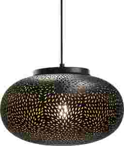 Introduce a romantic mood with the 7.75in. Yaylin Court pendant designed with uniquely scattered cutouts. Features a black iron exterior with an antique brass iron interior. Install in multiples for a creative statement. Professional installation by an electrician is recommended.
