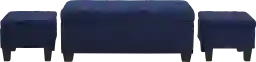 The Yoest blue 3pc storage ottoman set has lots of functionality. Enjoy extra seating and plenty of storage space from its full-sized bench or indulge in a footrest from its two smaller ottomans. A chic tufted top paired with rich espresso feet make this set the perfect choice for any home. Customer assembly is required.