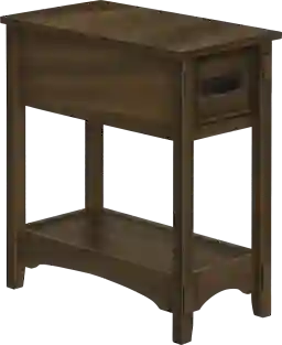 Are you looking to add a touch of style and sophistication to your bedroom or living room Look no further than this Yonview 24-inch-high walnut veneer accent table. This fashionable and practical side table is durably designed to last for years. The easy to clean top makes it perfect for placing items such as a lamp, books, magazines along with a bottom shelf for added storage. The space saving design includes a storage drawer with a classic black metal pull handle to tuck away small essentials. The walnut brown veneer finish makes this end table design look timeless and transitional, perfect for any type of home decor. Whether you are looking for a narrow nightstand to add to your bedroom or as a side table next to a chair or sofa in your living room, this versatile accent table is the perfect solution. Customer assembly is required.