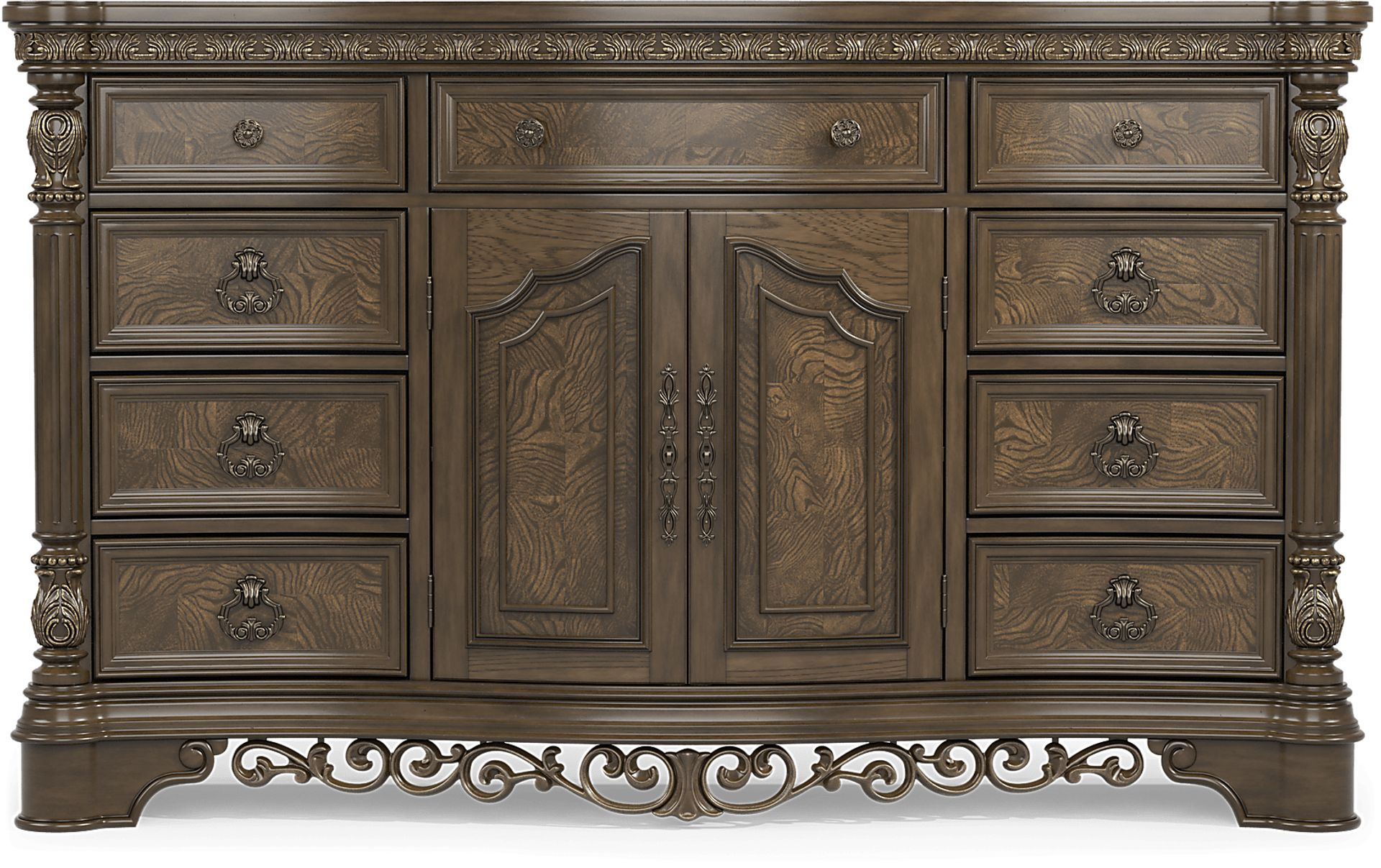 For those looking to add a touch of traditional style to their bedroom space, the Yorkshire Manor dresser is an excellent choice. This piece, inspired by the look of classic European furniture, is crafted of assorted wood and veneer solids in a rich brown finish that is pleasing to the eye. Nine dovetail drawers and two doors provide ample room to store clothing and other essentials.