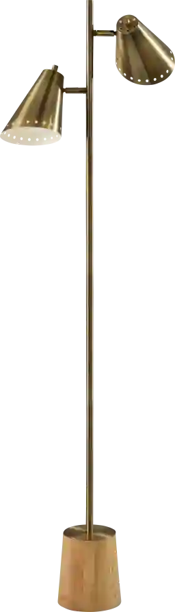 Introducing the Yosomite Street Brass Floor Lamp, a stunning blend of elegance and function that adds sophistication to any room. Featuring an antique brass finish and two adjustable cone-shaped brass metal shades, this lamp offers both style and versatility. Standing at 60.5 inches tall with a chunky natural wood base for added stability and charm, this floor lamp brings a warm, modern touch to your home. Each shade is equipped with its own on/off rotary socket switch, providing flexible lighting options perfect for reading, working, or relaxing. Partial assembly may be required.