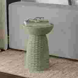 The Yumma mango wood accent table in green wash brings bold style and eco-conscious craftsmanship to your space. Made from sustainable mango wood, its vibrant green wash finish and textured hand-carved design make it a standout piece. Perfect for adding color and functionality to living rooms, family rooms, basements, or bedrooms, this table is both durable and visually striking. Customer assembly is required.