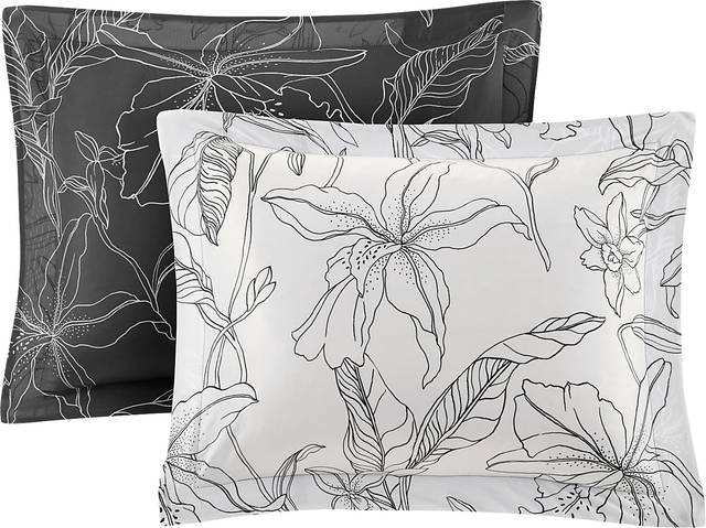 The Zaide 9 piece reversible complete bedding set with cotton sheet set offers a stunning modern update to your bedroom decor. The reversible comforter and shams feature a botanic print in charcoal gray on a white base that flips the color scheme on the reverse, for a rich contemporary look. A solid gray bed skirt and a square decorative pillow with embroidered details add the perfect finishing touches. Hypoallergenic polyester filling in the comforter and decorative pillow provides exceptional warmth and comfort. Also included is a 100% cotton sheet set with a flat sheet, fitted sheet, and pillowcases. The fitted sheet fits mattresses up to 16-inches. Machine washable for easy care, this reversible complete bedding set with cotton sheet set brings a full and stylish transformation to your bedroom. This set includes 1 comforter, 1 bed skirt, 2 shams, 1 flat sheet, 1 fitted sheet and 2 pillowcases and 1 square pillow.