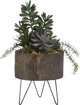 This silk plant is set in a rustic wood planter that features elegant wire legs. This design choice aligns perfectly with the mid-century modern style, blending natural textures with industrial-inspired metal accents. The combination ensures the piece functions as a sculptural decor element that complements both contemporary and rustic interiors.