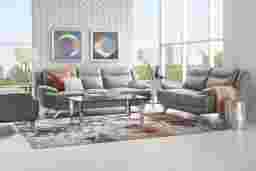 Contemporary style. Plush comfort. The Zamora sofa artfully combines modern design with practical usability for a cozy chic result that transforms your living room into a sophisticated entertaining space. Featuring luxuriously supple gray top grain leather covering where the body touches, this chic sofa is further accented by stitching detail. Plush pillowtop arms and striking chrome finished legs represent the careful balance of practicality and style. Upholstery: Top grain leather where the body touches and polyurethane fabric sides and backs.