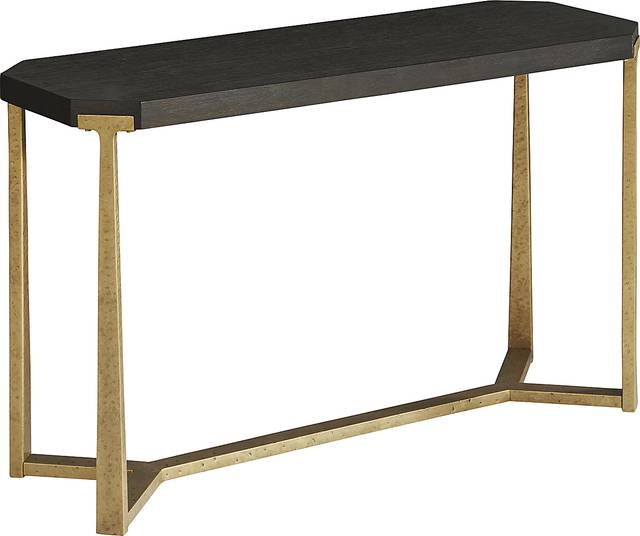 The Zandra sofa table boasts a bold, modern look. Crafted of walnut veneers in a brown finish, its tabletop is the perfect size for displaying picture frames or small decorations. Gold-finished metal legs form a striking geometric shape that adds to this table's sharp look.