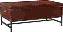 This table blends traditional charm with industrial-inspired details. The "restyled antique" look is achieved through the rich brown finish and the distinctive studded accents that line the edges of the table. The heavy-duty metal handles on the sides further reinforce its vintage, trunk-like appearance, making it a focal point for traditional or rustic-industrial decor schemes.