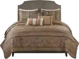To add a touch of richness to your current decor, the Zavis 6 Piece reversible quilt set can update your room in seconds. Made from polyester jacquard, the quilt and shams share leaf, striping and ironwork motifs that are accentuated by ivory stitching on a chocolate brown base. Pops of gold are also used throughout this collection adding a lavish feeling to your decor. Three decorative pillows feature pleating and embroidery details that correspond back to the quilt to bring this entire look together. Customer assembly is required.