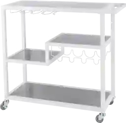 This cart features a robust metal frame with a clean white finish for long-term structural integrity. The three shelves are crafted from smoky gray mirror, providing a sophisticated, reflective surface that is both durable and easy to maintain when handling mixers and spirits.