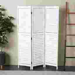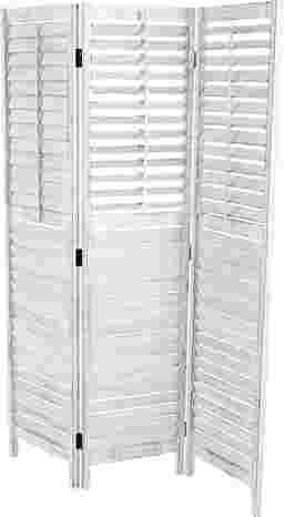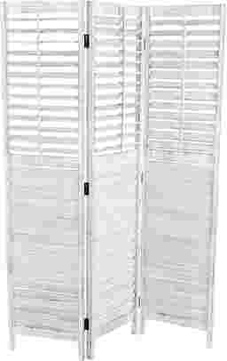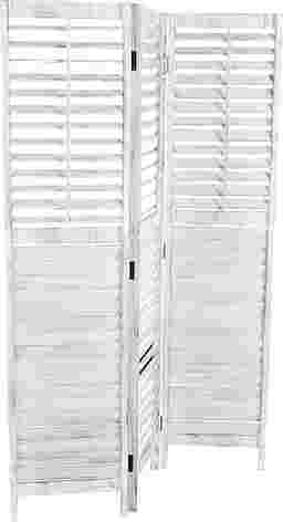 Introducing the Zevna room screen. Designed with rugged beauty and an earthy charm, where natural simplicity, warmth, and organic materials create a wholesome atmosphere. Crafted from resilient paulownia wood and brass, this white partition room divider screen is designed to endure and maintain its appeal over time. Rectangle room divider and folding privacy screen features a washed white finish that's accented with hints of gray distressing, providing an authentic vintage finish. Wood room divider screen showcases a unique shutter top and three panels in a washed finish, presenting both style and functionality. Customer assembly is required.