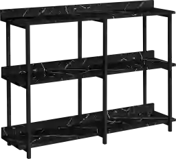 Proudly display prized possessions on this rectangular console table with 3-tier shelving. Underneath the long, narrow tabletop are shelves arranged on 2 levels. Distribute books, plants, and decorative items among the tabletop and shelves, which are in a elegant black marble-look laminate finish. The sturdy metal frame in black finish features clean lines and right angles for a modern look. With its narrow profile and generous display space, this versatile accent table with storage is ideal for a hallway, an entryway, or behind a sofa in a living room. Customer assembly required.