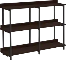 Proudly display prized possessions on this rectangular console table with 3-tier shelving. Underneath the long, narrow tabletop are shelves arranged on 2 levels. Distribute books, plants, and decorative items among the tabletop and shelves, which are in an elegant dark-brown espresso laminate finish. The sturdy metal frame in a contrasting black finish features clean lines and right angles for a modern look. With its narrow profile and generous display space, this versatile accent table with storage is ideal for a hallway, an entryway, or behind a sofa in a living room. Customer assembly required.