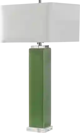 Finished in a striking tropical green glaze, the ceramic Zion Boulevard lamp is accented by thick crystal ornaments and brushed nickel accents. The square hardback shade is a white linen fabric. Partial assembly may be required.