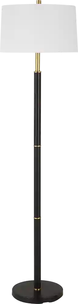 Simple in design, the black metal Zorro Circle floor lamp is embellished with gold rings equally spaced along the length of the body. Finished with a slightly tapered hardback shade in a soft white linen fabric with light slubbing. Partial assembly may be required.
