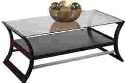 Curved ends and a glass top give the Zurich cocktail table a contemporary spin. The table has a lower display shelf for magazines and books. Made of wood solids, the table features a rich brown finish. Customer Assembly Required