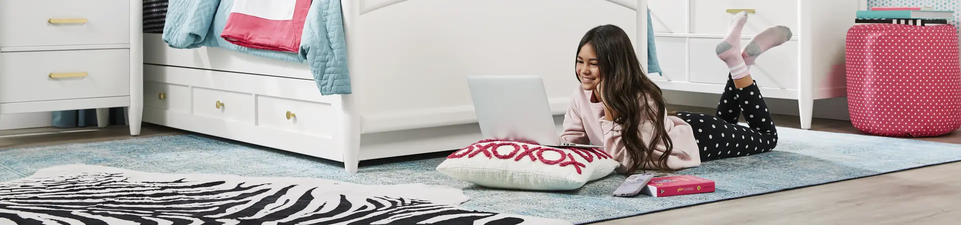 Decorating a teenage girl bedroom is all about the details. Incorporating wall art for girl, girl accent pillows, and lamps for a girl room adds layers of texture and personality. Kids' storage lockers and kids' chests offer functional and stylish solutions, while kids' ottomans provide a chic touch. These elements together create a space that's uniquely hers.