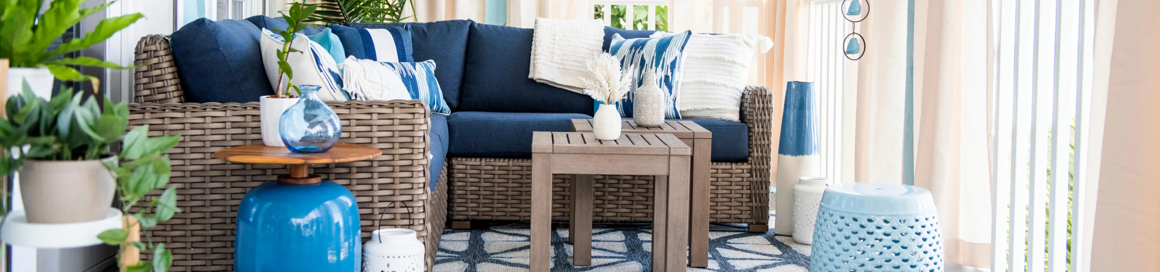 Coastal Wicker Vibes: Capture the essence of the coast with wicker furniture in blues and sandy neutrals. Outdoor wicker sectional sofas and patio dining sets in these calming shades evoke a serene, beachy atmosphere perfect for relaxed gatherings.